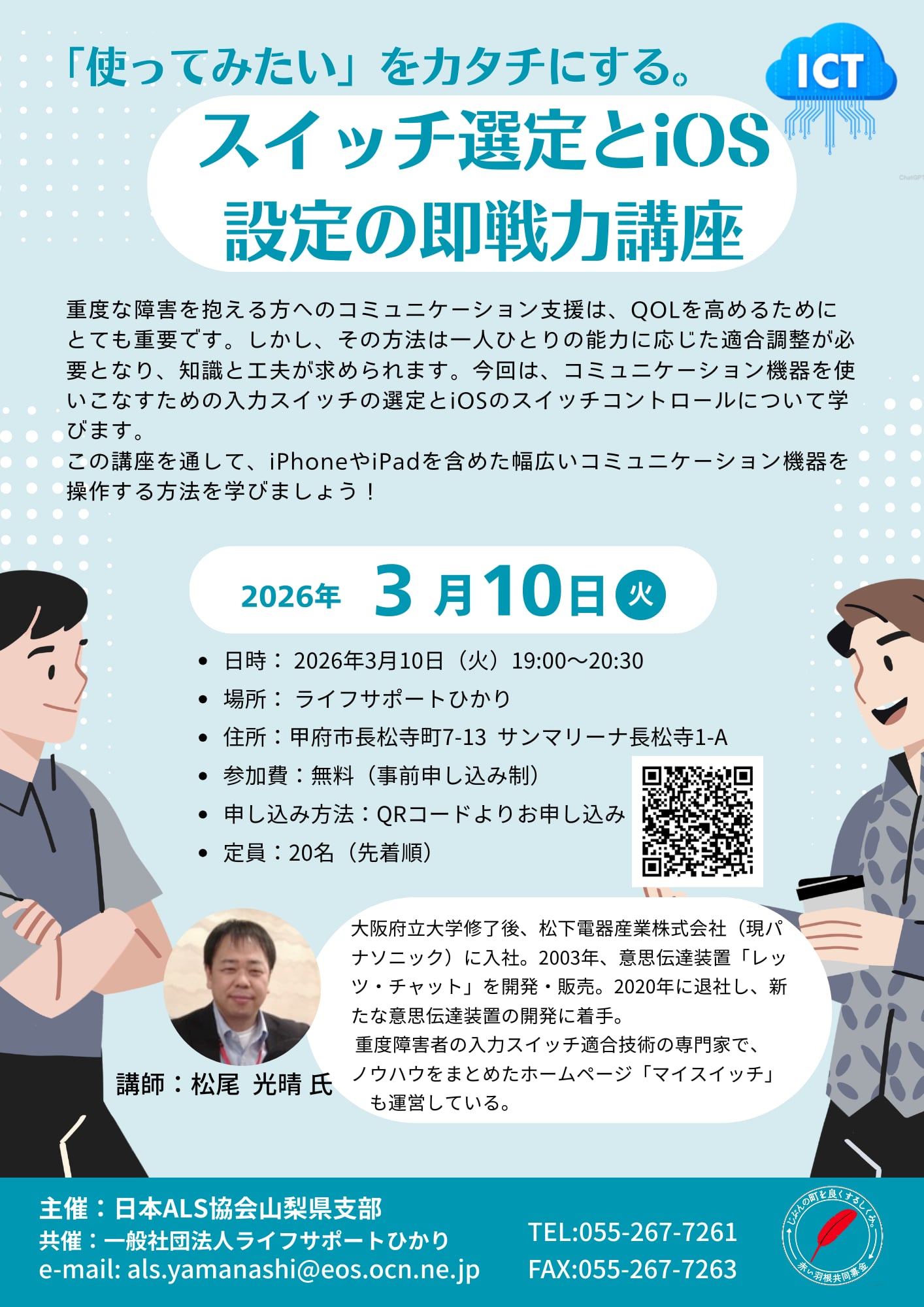 | 7月15日 (木) | リモート | <詳細ページはこちら> 18:30~20:30 意思伝達装置ファイン・チャットと入力スイッチについて、気軽に学べる短時間の勉強会です。 機材の貸出はいたしませんが、質疑応答の時間がありますので、日ごろ疑問に思っていること、困っていることなど気軽にお尋ねください。 (ショートバージョンのため機材の貸出はありません) |